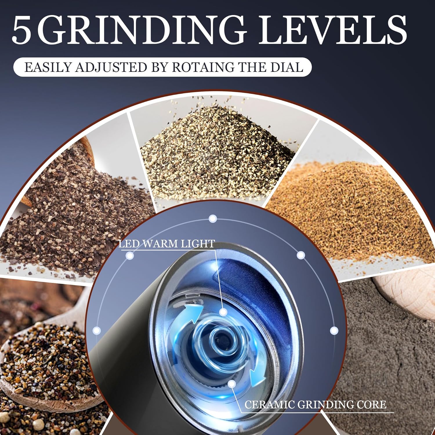 - 【CONVENIENT ONE-HANDED OPERATION】Rechargeable Gravity Seasoning Grinder Set with Gravity Sensor Switch All you have to do is tilt the salt and pepper grinder and it will automatically start grinding, equipped with a warm LED light to easily see the dose of seasoning to sprinkle, and twist the body of the grinder to turn on the gravity-sensing mode before the first time you use it.