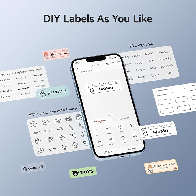 - 【Multiple Creative Templates】-This app of sticker printer provides a variety of free templates, containing texts, symbols, logos, barcodes, QR codes, images, time, etc.Easy to create various cute labels from your smartphone. Labels are fixed in length, not support continuous label tape.