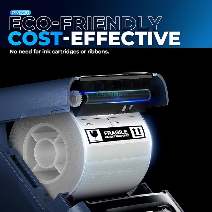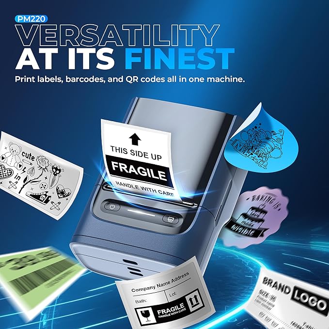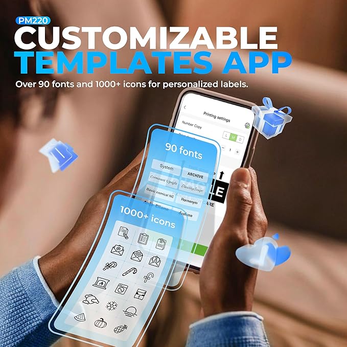 - Powerful APP- The PM220 label maker machine with tape comes with label templates and can set up your own templates. Please do not tear or destruct the green sticker on the back of the label strip, otherwise it will affect the printing effect. This label printer allows you to customize and format labels, supporting various features such as QR codes, barcode labels, tables, materials, time, figures, text, icons. This label maker machine with tape APP included more than 90 +Fonts, 14+ Languages, 450+ Materials