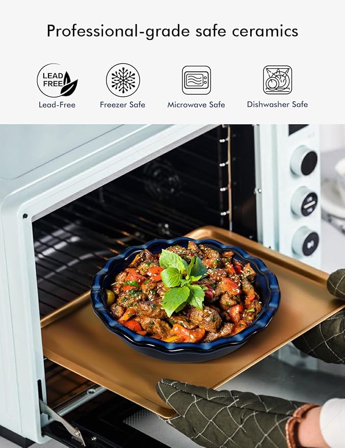 - Heat Performance & Safety: Made from food-safe ceramic, our pie pans distribute heat evenly, suitable for use in ovens, microwaves, and more. The deep dish pie pan can also be used in dishwashers and refrigerators, adding flexibility to your kitchen routine.