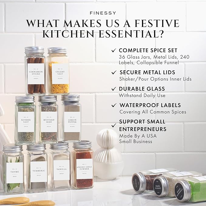 - MINIMALIST SPICE SET FOR A MODERN PANTRY: Achieve a clean and modern look in your kitchen with our 36-pack spice containers with labels. Featuring 240 sleek, waterproof labels and a collapsible silicone funnel, this all-in-one set ensures your spices stay organized and easily accessible, all while adding a minimalist touch to your space