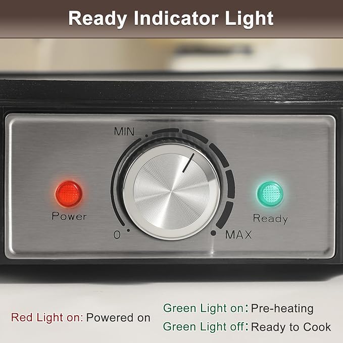 - Precise Temperature Control & Indicator Light: Control the cooking temperature you need at any time, the heat can be adjusted from the minimum to the maximum, the red light indicates that the crepe maker machine is powered on, the green light indicates that the crepe pan is being pre-heated, the green light disappears to indicate that you can start making crepe.