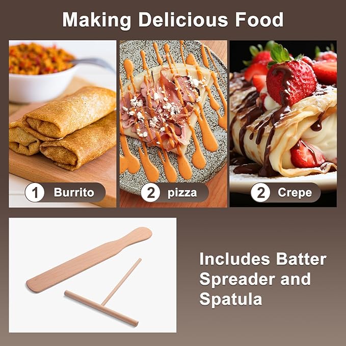 - 1000W High Power: The high power of 1000 watts ensures that the crepes are quickly made and fully heated in no time, and you can also use the crepes maker to make pancakes, omelets, Roti, Tortilla, Blintzes, and many more breakfast favorites!
