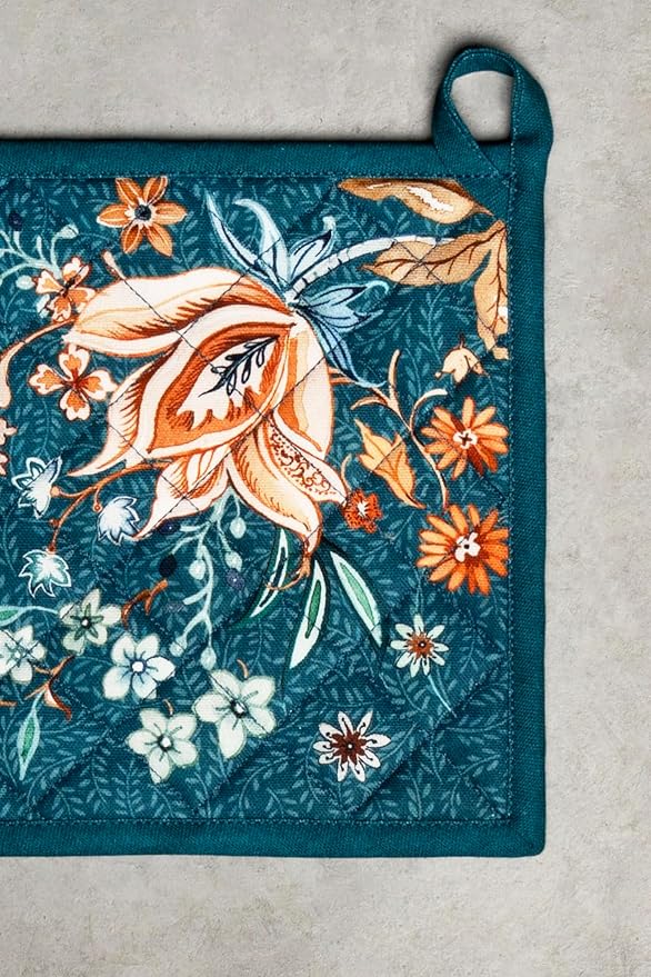 - Package includes: 1 pot holder measures 8"x8". Ideal as a hot pad for dishes, coffee pots, cast iron pans, or cookware. Designed in Europe and Made in India, it blends style, function, and comfort into a daily kitchen essential