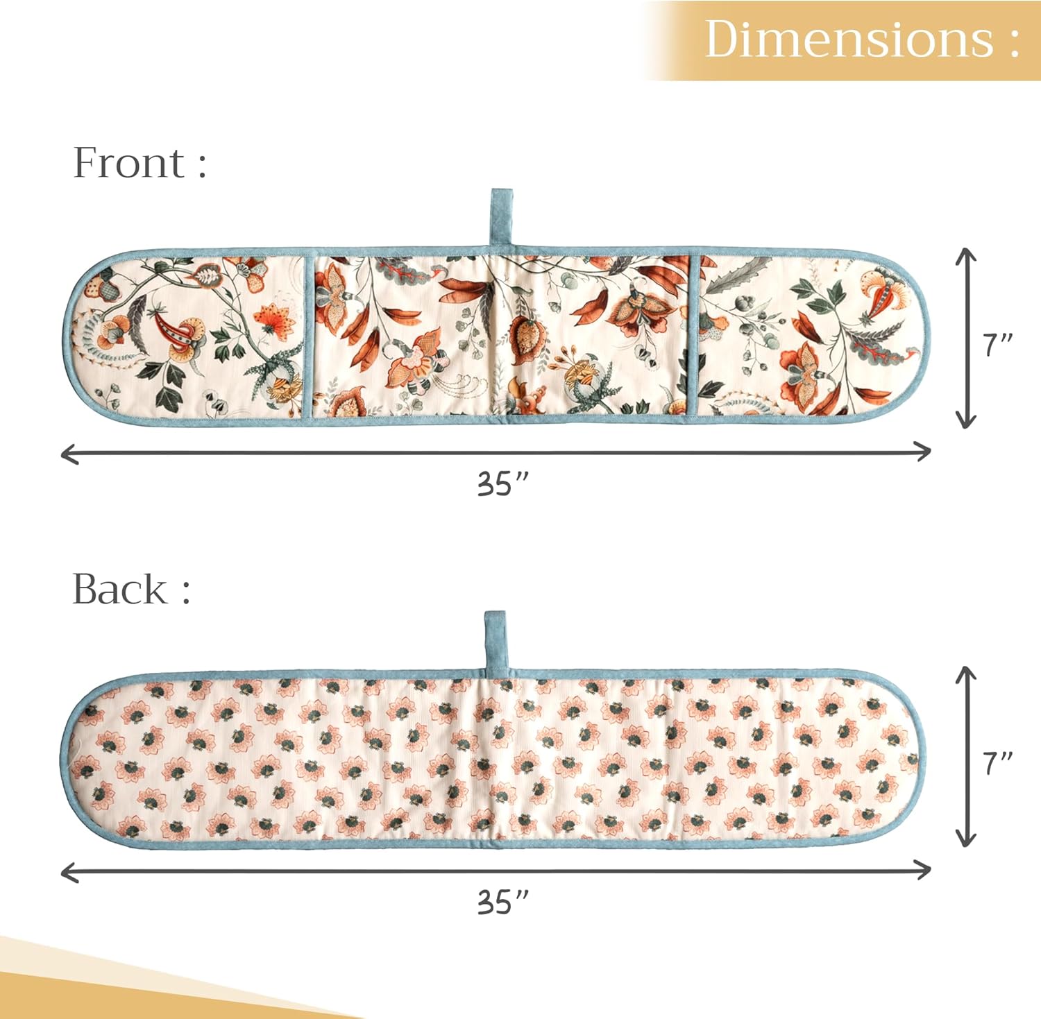 - Package includes: Includes 1 double oven mitt sized 7"x35". Perfect for handling hot cookware safely while adding a touch of European elegance to your kitchen. Designed in Europe and made in India with care