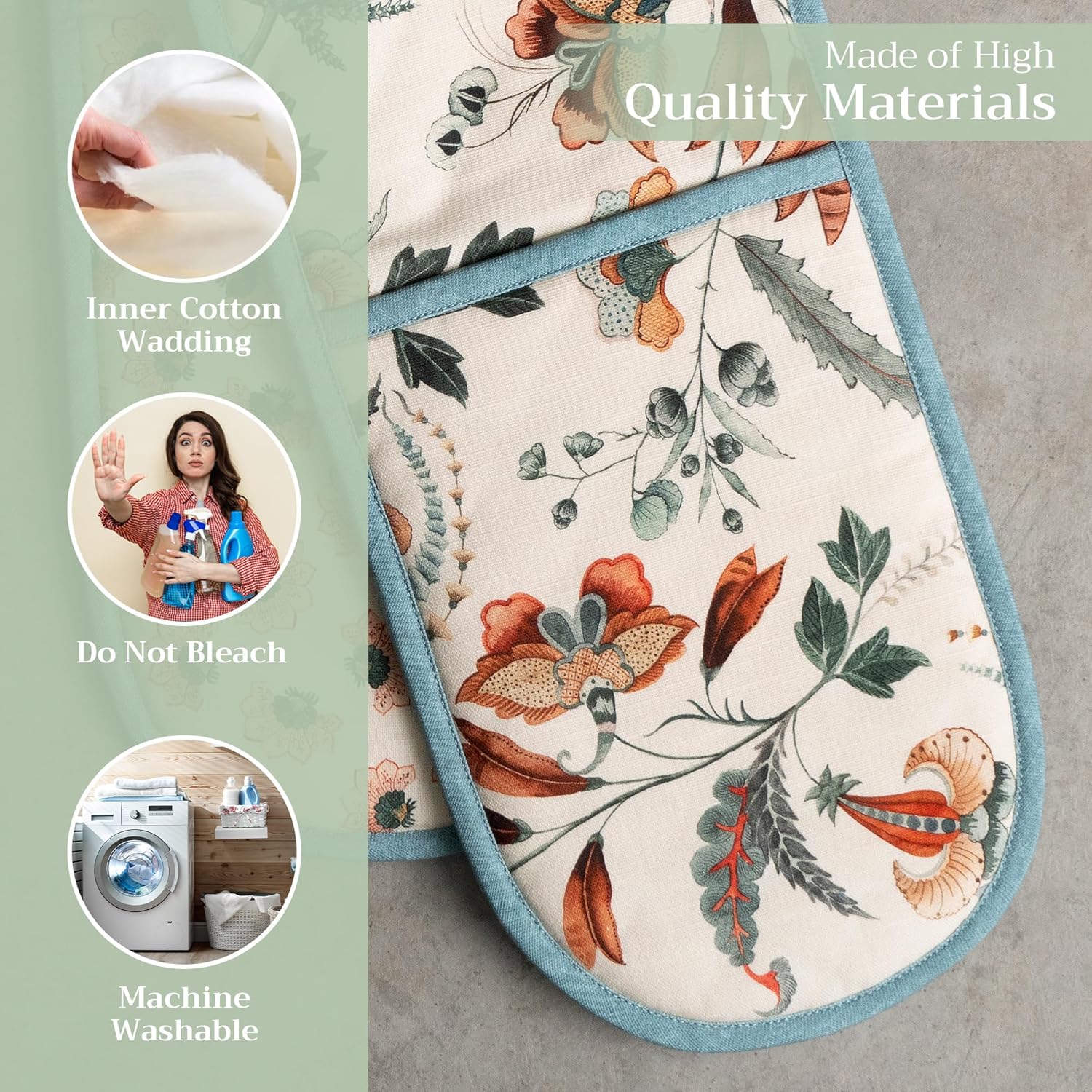 - 100% Quilted cotton: Crafted from premium quilted cotton for superior heat resistance and durability. This double oven mitt offers a soft, flexible grip and protects your hands during baking, roasting, or grilling