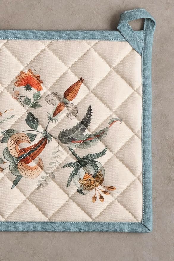 - Package includes: 1 pot holder measures 8"x8". Ideal as a hot pad for dishes, coffee pots, cast iron pans, or cookware. Designed in Europe and Made in India, it blends style, function, and comfort into a daily kitchen essential