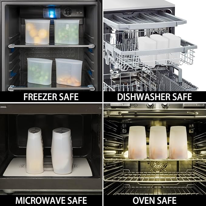 - 【DISHWASHER FREEZER MICROWAVE OVEN SAFE】Tired of dealing with plastic bags?(PEVA is actually a type of plastic.) Switch to silicone bags reusable storage and spend less time worrying about saving leftovers safely. These reusable bags are non-toxic and safe for use in the Microwave, Freezer, Oven and Dishwasher. They can even withstand temperatures up to 428℉, making them ideal for all your food storage needs