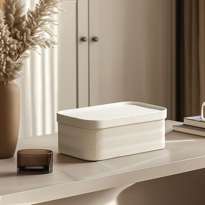 LA JOLIE MUSE Fluted Cardboard Storage Baskets with Leather-Like Lids, Paper Boxes Decorative Tray, Modern Basket Organizer Bins for Organizing,Eggshell White