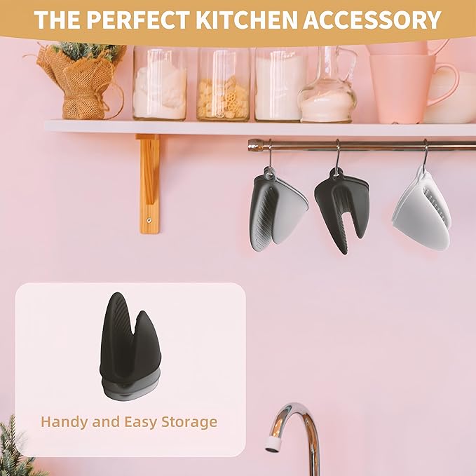 - GRIP AND PROTECT: These mini silicone oven mitts feature heat-resistant and anti-slip silicone construction that protects hands from heat up to 446°F while allowing a secure firmly grip.