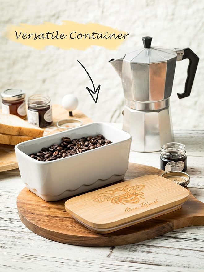 - Enhance Your Kitchen Decor: Add a farmhouse touch to your kitchen with our ceramic butter dish. Available in three stylish colors, the honeybee pattern on the wooden lid and wave design complement any kitchen decor.