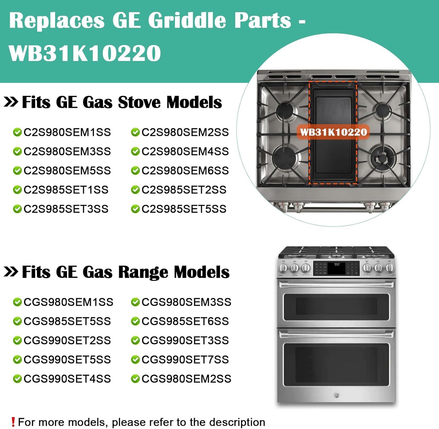 - ► Fits GE Gas Range Griddle Replacement - CGS980SEM1SS, CGS980SEM3SS, CGS985SET5SS, CGS985SET6SS, CGS990SET2SS, CGS990SET3SS, CGS990SET5SS, CGS990SET7SS, CGS990SET4SS, CGS980SEM2SS, CGS980SEM5SS, CGS980SEM6SS, CGS985SET1SS, CGS985SET2SS, CGS985SET3SS, CGS985SET4SS, CGS985SET7SS, CGS985SET8SS, CGS985SETASS, CGS990SET1SS, CGS990SET8SS, CGS990SET9SS, CGS980SEM4SS, CGS980SEM7SS, CGS985SET9SS, CGS990SET6SS.