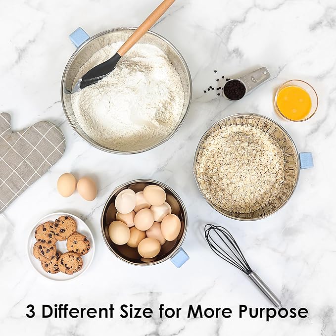 Rorence Stainless Steel Mixing Bowls Set: Non-Slip Silicone Bottom Kitchen Bowls with Pour Spout, Handle and Lid - Set of 3 - Light Blue