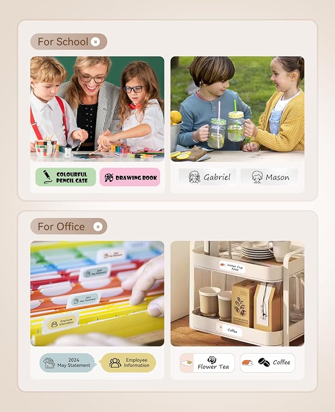 - 【Label Options and Organization】With Intelligent Identification technology, this mini label maker can automatically recognize the label you put in, support a variety size and kind of label paper, such as clear, colorful, cute gift tapes and round labels. The label refills is waterproof and Oil-proof, which can be widely used in Home Kitchen and School. (This label maker is monochrome printout, which only prints black text. We can create color labels buy using color pattern label tapes.)