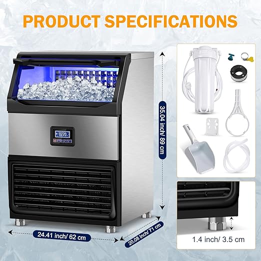 - Easy Installation and Use - This commercial ice maker machine comes with a full set of accessories. Simply connect the inlet and drain hoses, and it will automatically fill and drain the water. Start the ice-making cycle with ease. NOTE: Our stainless steel ice machine has a scratch-resistant protective film on the surface, which can be kept or peeled off as desired.