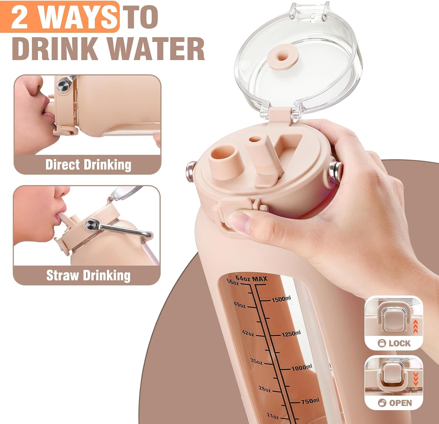 - Glass Water Bottle with Straw Lid: Our 64 oz glass water bottle, furnished with a convenient straw lid, showcases an innovative and fail-safe design. Its pioneering one-click button system simplifies the drinking process—just a gentle press and the lid opens automatically, ensuring a hassle-free experience.
