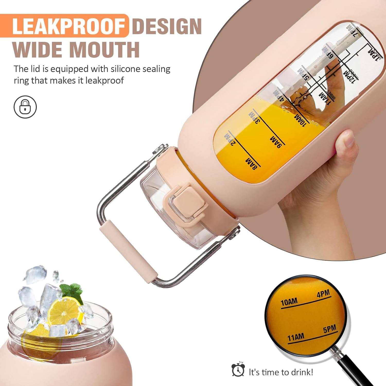 - More Function- Kytffu glass water bottle with silicone sleeve which provides more grip and prevents the water bottle from slipping out. This large motivational water bottle has a wide mouth, which makes it not only easy to hold ice cubes and fruit but also very easy to clean, you can use our complimentary cup brush to clean your water glass.