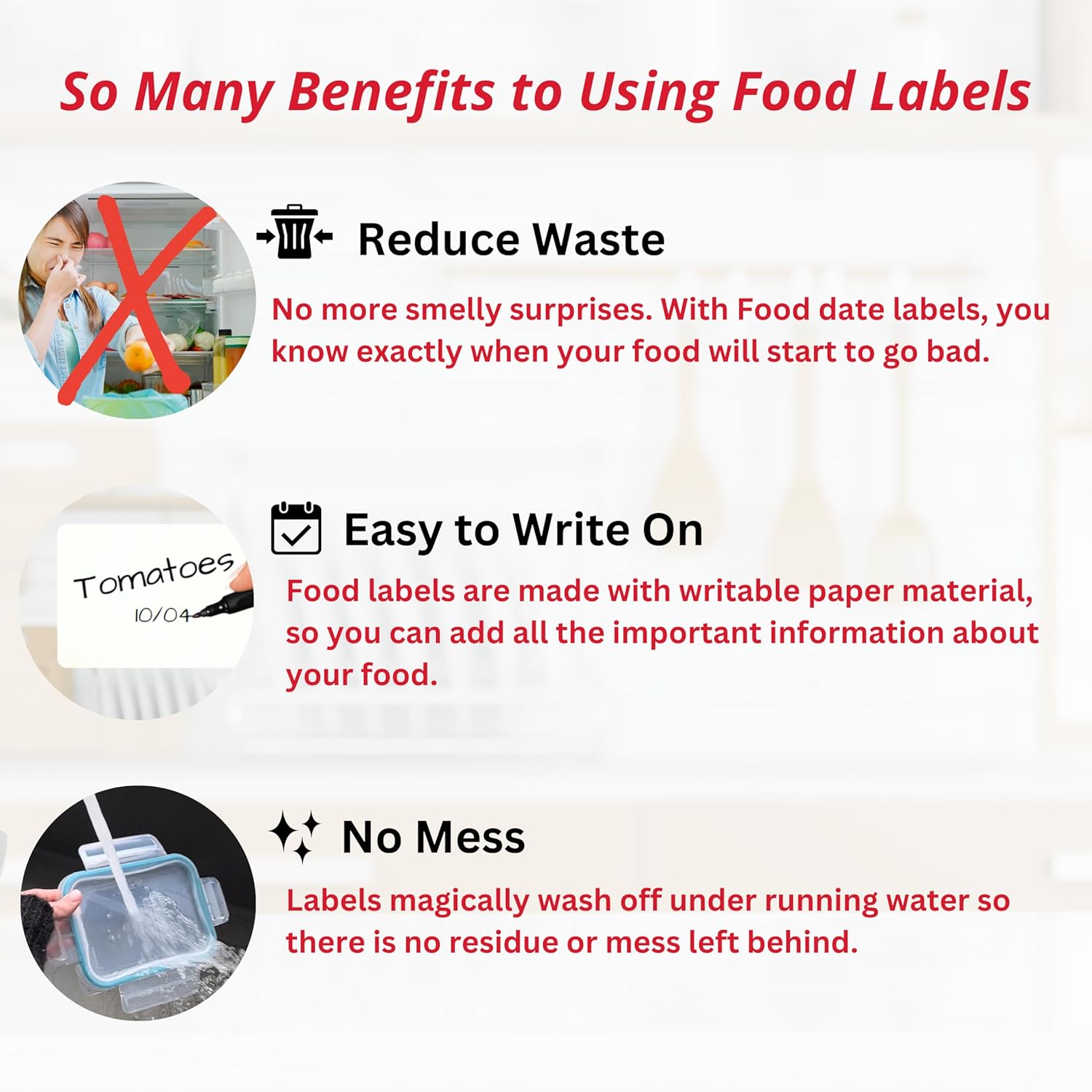 - Fully Dissolvable: These labels for food containers dissolve completely in water, whether in the dishwasher or under running water, leaving no sticky residue behind. They are perfect for labeling food containers or freezer storage and can be effortlessly removed after use.