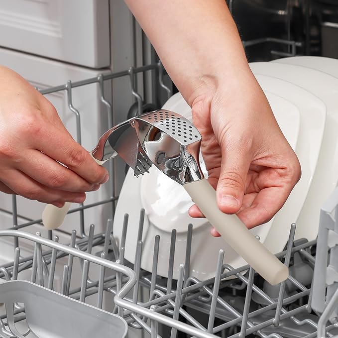 - EASY TO CLEAN: Simply rinse your garlic and ginger press tool under running water and use the included cleaning brush to get rid of any garlic bits or place it in the dishwasher for a quick clean up. Can be washed on the top rack dishwasher but hand wash is suggested. We recommend rinsing the garlic crusher right after use to avoid residual pulp and fibers hardening up.