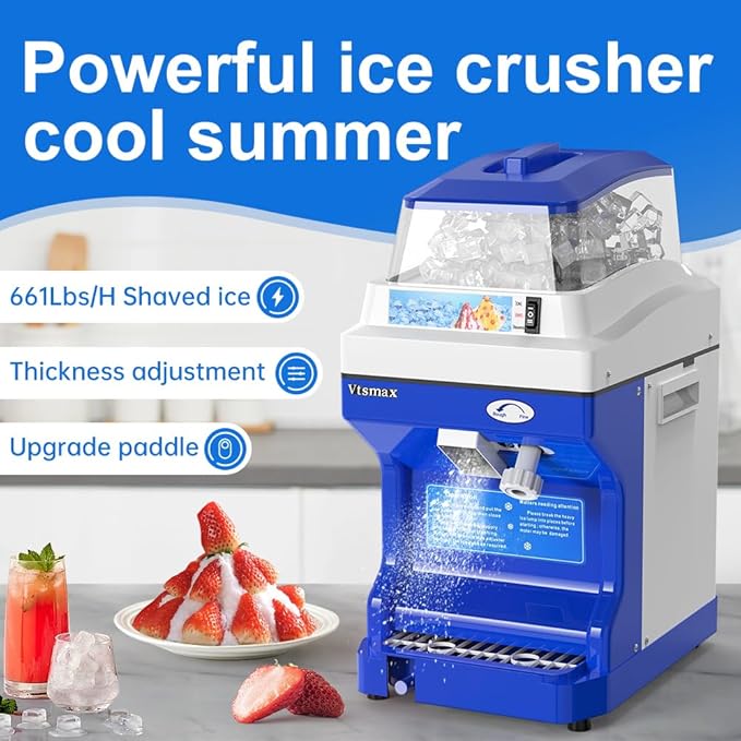 - 【5.8Qt Large Capacity】Compared with other ice shavers, the Vtsmax automatic shaved ice machine is equipped with an extra large storage bucket to reduce the trouble of ice replenishment. Equipped with PC dust cover, healthy and hygienic. Easily meet the needs of dessert shops, restaurants, seafood shops, bars, parties, etc., suitable for making ice cream, smoothies, milkshakes, yogurt freezers, and other delicious frozen beverages