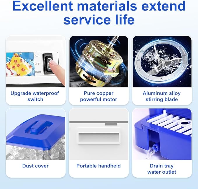- 【Intimate details】Adopt high-quality ABS material and aluminum alloy stainless steel blade (plastic blade, poor quality) to prolong the service life of the machine, consider for your wallet. The large base increases the stability of the machine and reduces noise. At the same time, electric snow cone maker is additionally upgraded with a drain pipe to make your use more comfortable