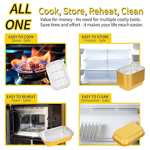 - 【High Quality Safety & Time Saving】JARDLITE gold aluminum foil pan is made of high quality aluminum material, which is 2 times harder than other silver aluminum foil pans, lightweight and sturdy, not easy to deform, high temperature resistant, and can withstand oven temperatures up to 600°F. Food grade plastic cover. Does not contain harmful substances, healthy and safe. Use these takeout containers to pack food and do all the work, saving you time!