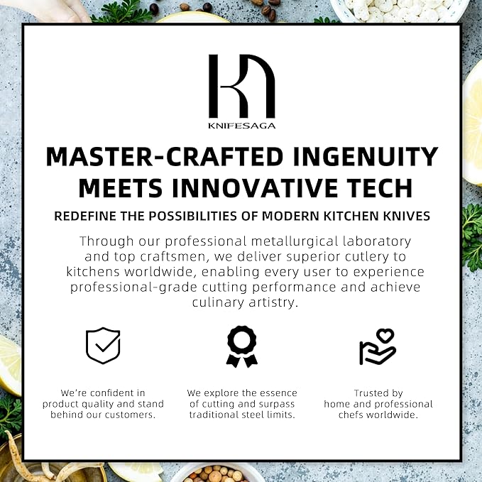 - Confidence in Every Cut: KnifeSaga has developed an innovative steel with optimized structural composition and carbon content. Each blade features an incredibly sharp 10° cutting edge, ensuring every slice is smooth, swift, and precise.