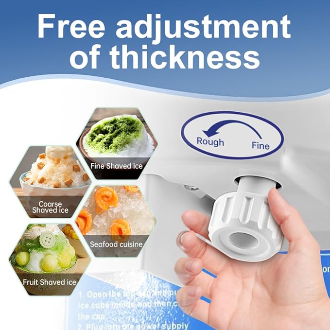 - 【Strict Quality Control】Vtsmax shaved ice machine is made of high-quality ABS material and stainless steel material. The food-grade stirring paddle is made of aluminum alloy for a long service life and easy to clean to protect your health. Perfect for making delicious desserts for the whole family. It can be made into delicious slush and milkshake in minutes.