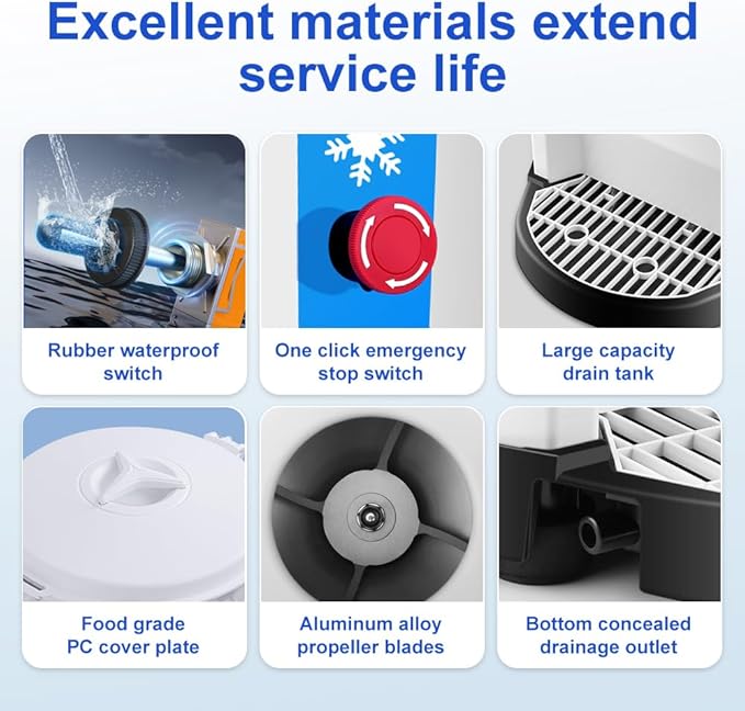 - 【Safe and Convenient Design】The food-grade stirring paddle is made of aluminum alloy for a longer service life. The drip tray at the bottom holds your cup, and the bottom is equipped with a spout that can be connected to a drain hose to prevent the melting ice from spilling. At the same time, the panic button ensures safety during operation. The ergonomic handle on the side of the machine allows for quick and easy movement.