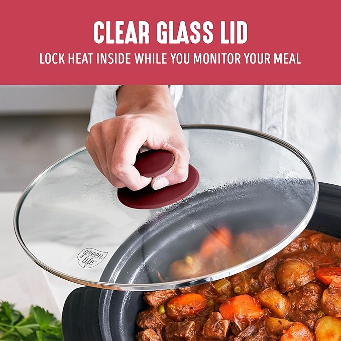 GreenLife 6QT Slow Cooker, Non-Toxic PFAS-Free Ceramic Nonstick Removable Interior Bowl, Programmable, Family Friendly, Keep Warm, Stovetop & Oven Safe, Dishwasher Safe Parts, Timer, Glass Lid, Red