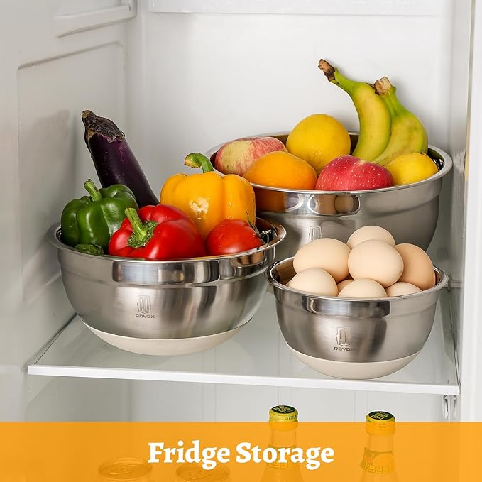- NON-SLIP SILICONE BASE: The silicone base of the mixing bowls ensures a secure grip, preventing them from sliding on countertops during mixing. Additionally, it protects surfaces from high temperatures.