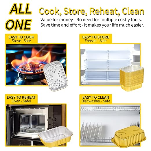 - 【High Quality Safety & Time Saving】JARDLITE gold aluminum foil pan is made of high quality aluminum material, which is 2 times harder than other silver aluminum foil pans, lightweight and sturdy, not easy to deform, high temperature resistant, and can withstand oven temperatures up to 600°F. Food grade plastic cover. Does not contain harmful substances, healthy and safe. Use these takeout containers to pack food and do all the work, saving you time!