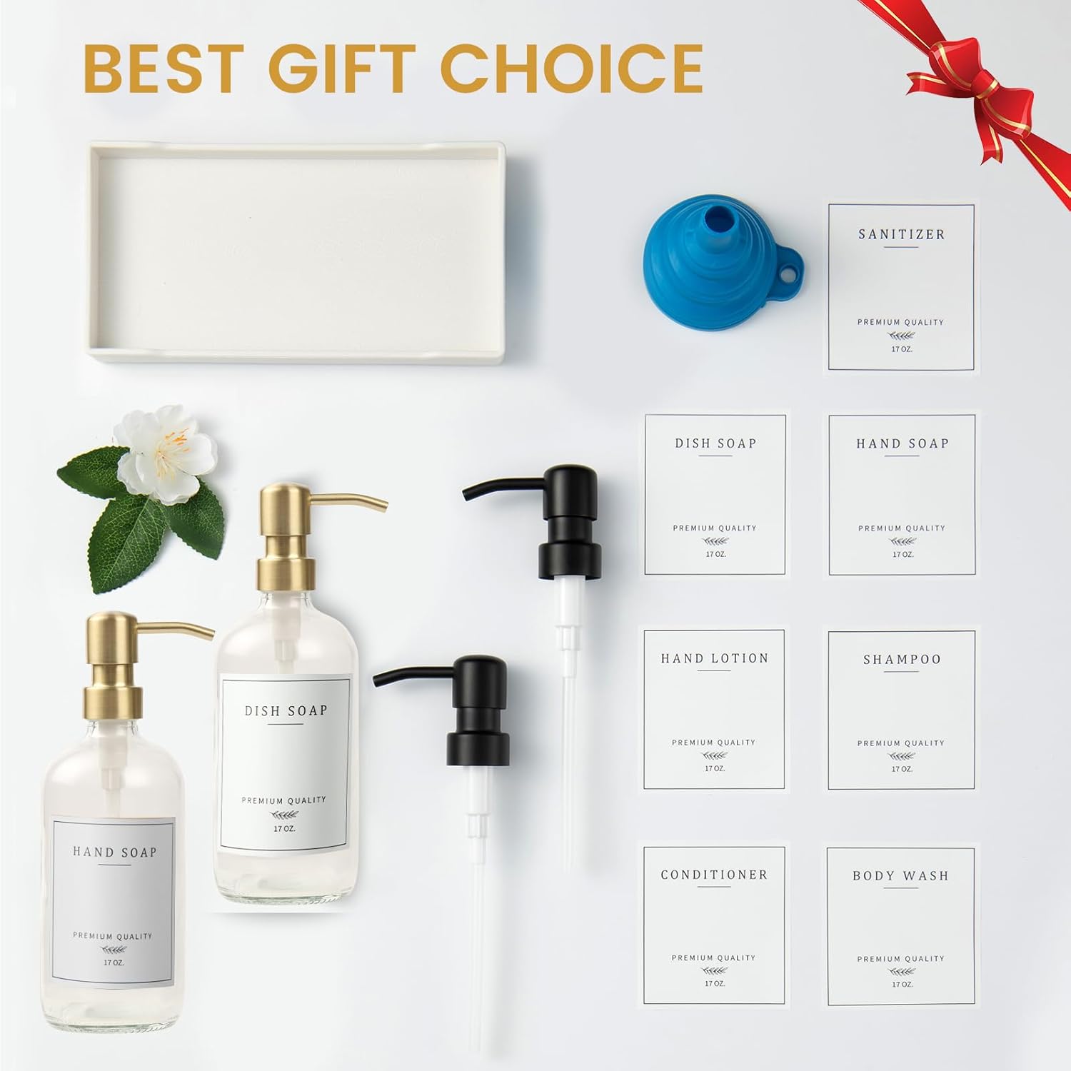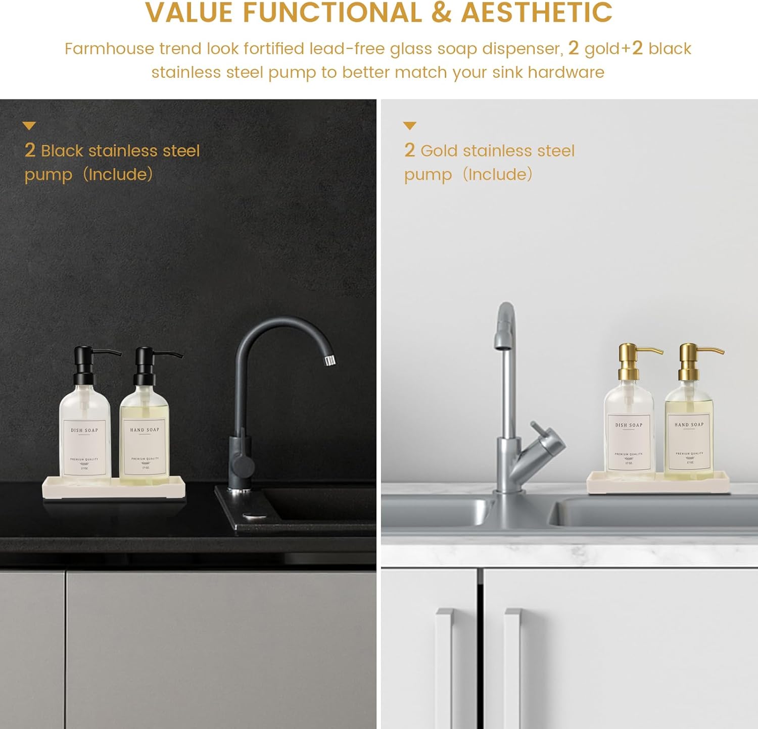 - GREAT VALUE FUNCTIONAL & AESTHETIC DISH AND HAND SOAP DISPENSER SET: 2 fortified lead-free reusable glass kitchen soap dispenser, 2 gold + 2 black stainless steel pump to better match your sink hardware, 1 collapsible silicone funnel, 1 white durable soap dispenser tray, 7 kinds of waterproof stickers ( Hand Soap, Dish Soap, Hand Lotion, Shampoo, Conditioner, Body Wash, Sanitizer), suitable for any style of home decor.