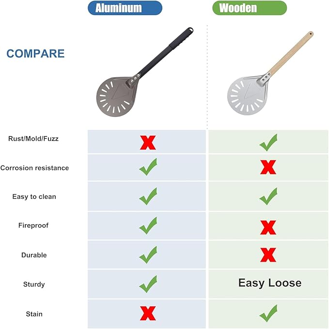 - PREMIUM MATERIAL: This metal pizza peel is made of high-strength and durable anodized aluminum. Not only resistant to high temperatures but also fall ,anti-rust. it is lightweight for easy handling and cleaning