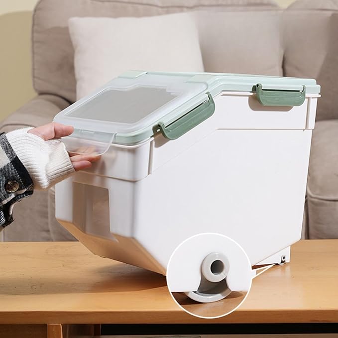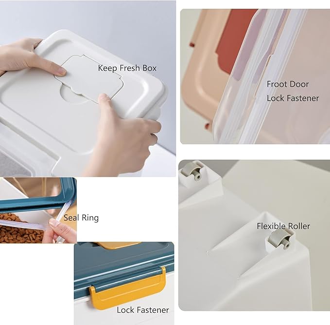 - Double sealing treatment, the front of the plastic dog food storage bin has a groove that can be easily taken out the box, with lids, convenient to use ; two castors in the bottom for convenient for daily carry and easy to move; food container uses a special design to assures food to stay fresh longer and keeps goods in containers secure.