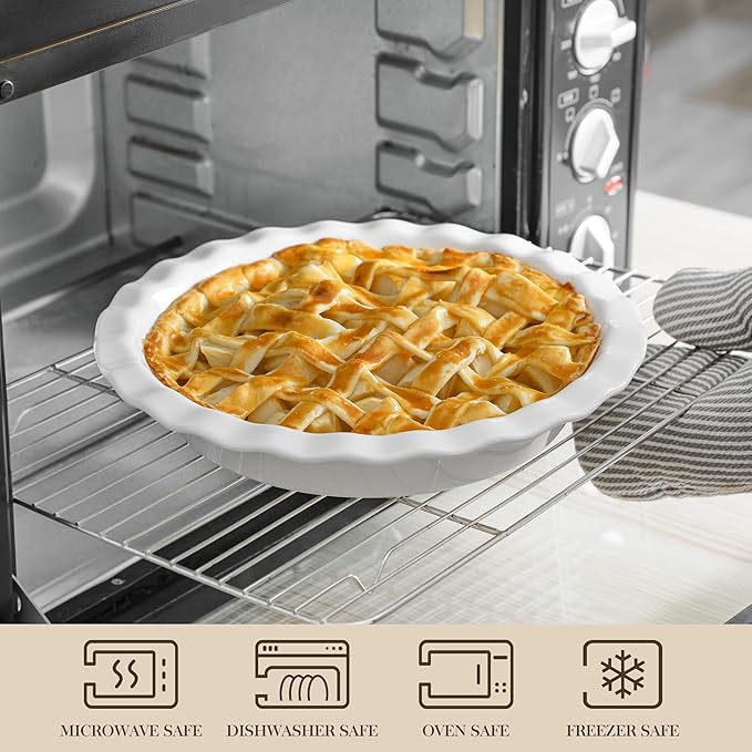 - 【Premium-Quality Pie Pan】Our 10.6 inch pie pan is crafted from high-grade ceramic with high purity, density, and stability, resisting staining, cracking and odors,ensure durability and even heat distribution for perfectly baked pies every time.36oz pie plate fit most standard pie recipe, with this pie dish, you will get a delicate and elegant meal!