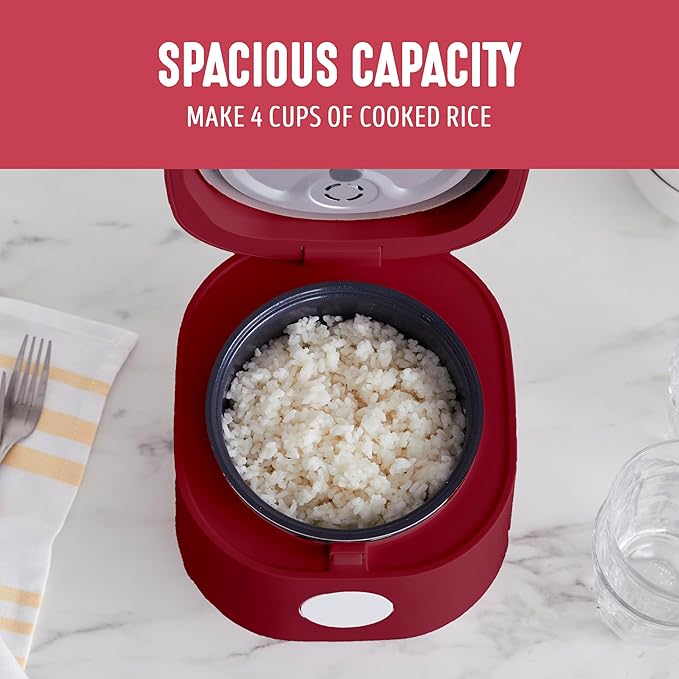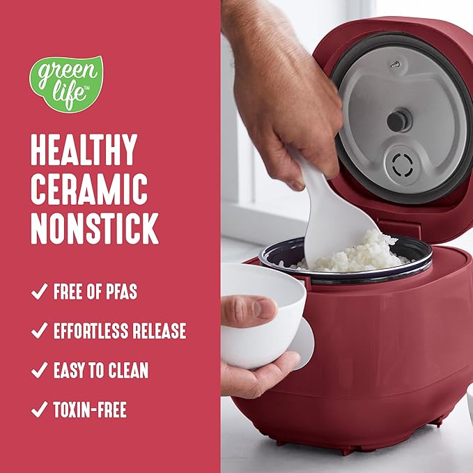 GreenLife Digital Rice Cooker, 2-Cups Uncooked/4-Cups Cooked, Removable Nonstick Ceramic PFAS-Free Pot, One-Touch Presets, Oats, Quinoa, Brown Rice, Auto Keep Warm, Fuzzy Logic Tech, 1.5 QT, Red