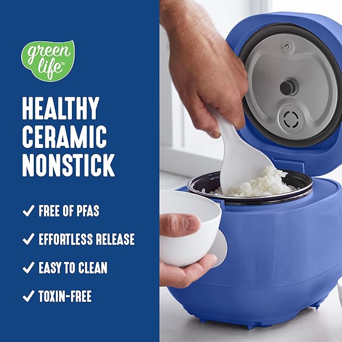 GreenLife Digital Rice Cooker, 2-Cups Uncooked/4-Cups Cooked, Removable Nonstick Ceramic PFAS-Free Pot, One-Touch Presets, Oats, Quinoa, Brown Rice, Auto Keep Warm, Fuzzy Logic Tech, 1.5 QT, Navy Blue