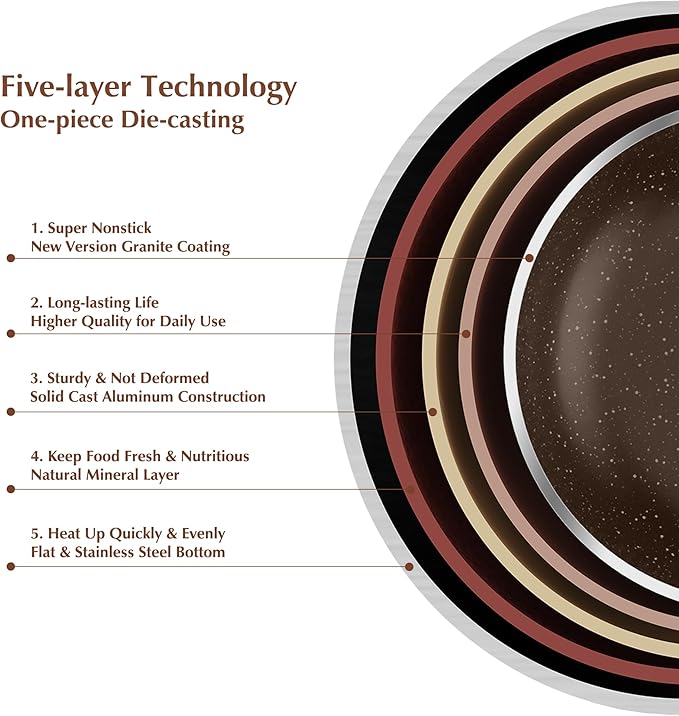 - New Technology of Composite Coating - Improved harder granite,10X enhanced for long-lasting nonstick performance. Free of Intentionally Added PFOA, smokeless, safe & healthy. Cooking with little oil for healthy diet.