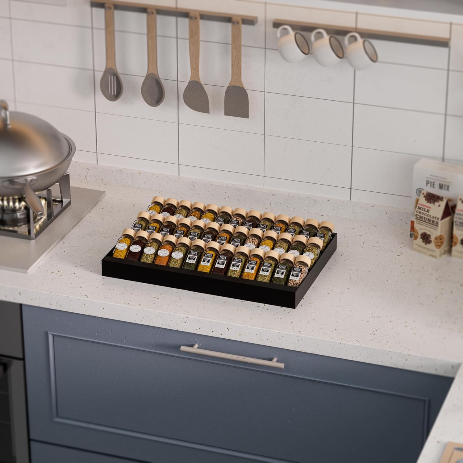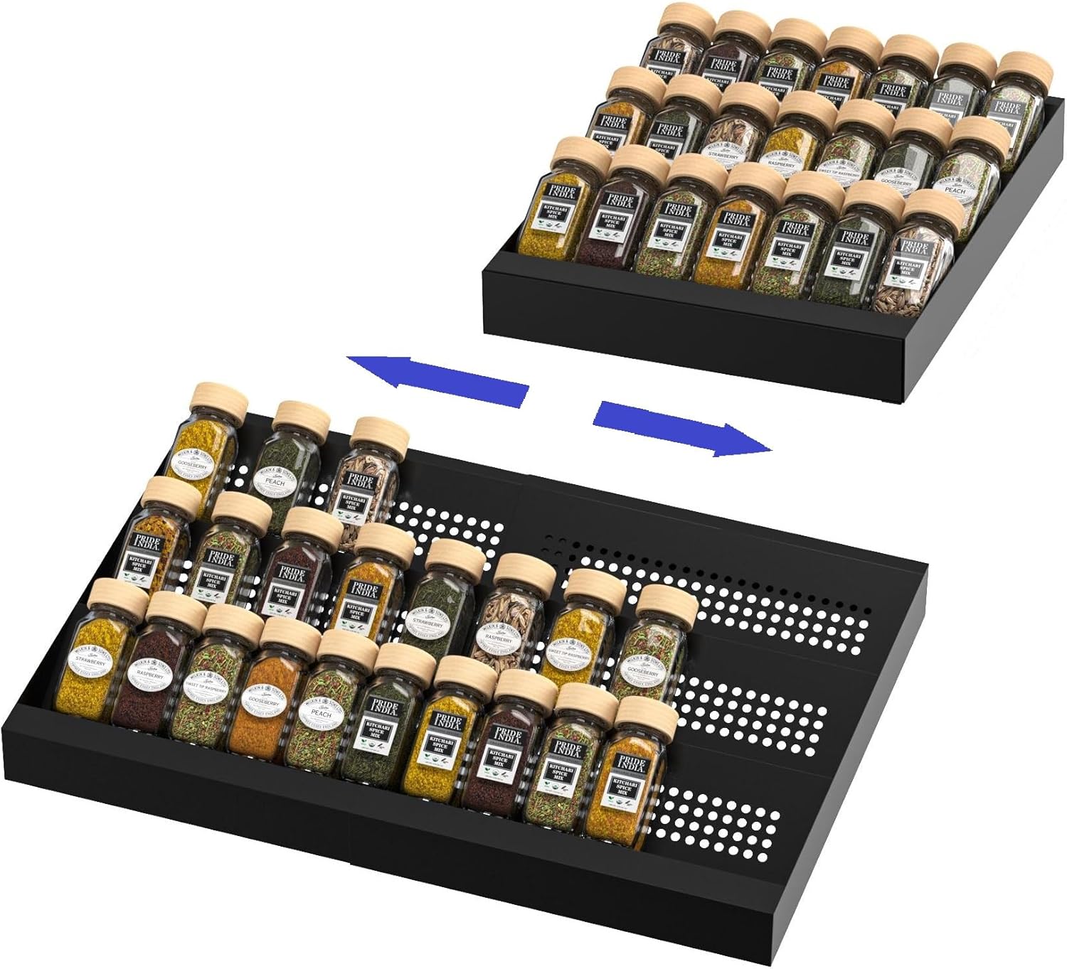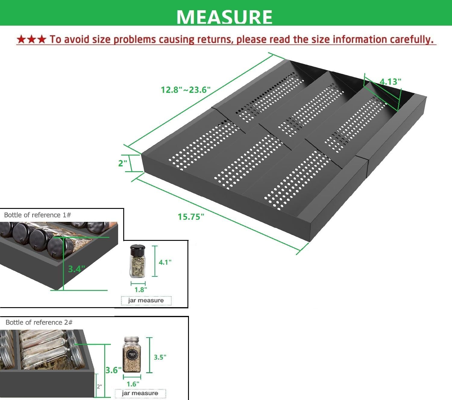 - ⭐【Expandable Spice Drawer Insert】Expandable width:12.8"W~23.6"W,suitable for most drawers,just need place the inserts in your drawer and adjust it to the desired size.With using the slanted levels spice drawer, the bottles will become clear at a glance, which is convenient for you to quickly select what you need.