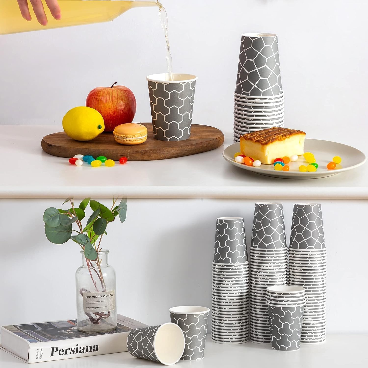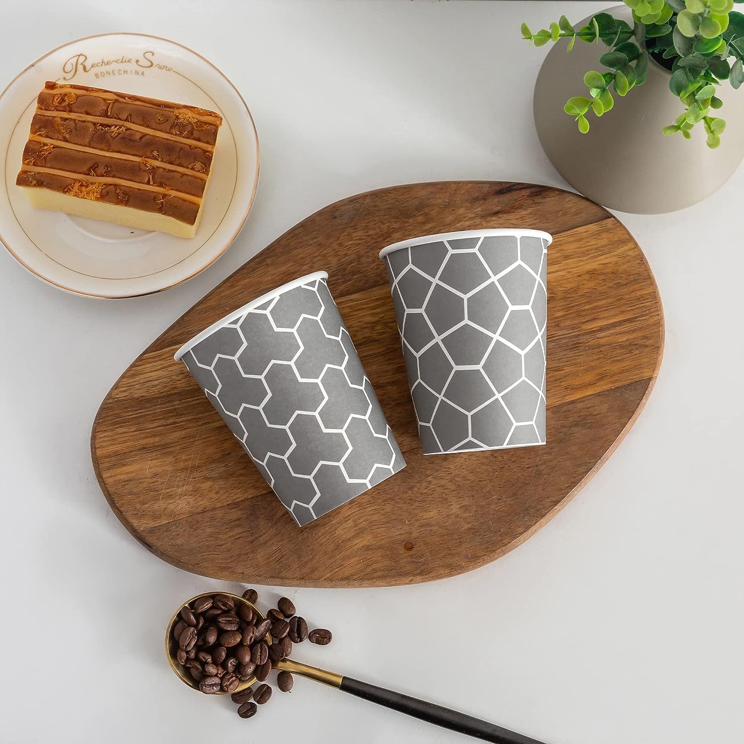 - Unique Style: These 12 oz paper cups with two irregular polygonal pattern memorable paper cup design that will stand out in a busy conventional hall or a jam-packed event