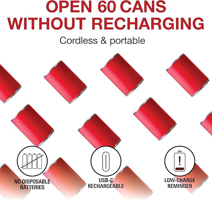 - OPENS 60 CANS ON A SINGLE CHARGE: This portable, rechargeable can opener is great for cookouts, picnics, camping and more. It has a battery indicator light that shows when it needs to be charged, and it fully charges in just 2 hours.