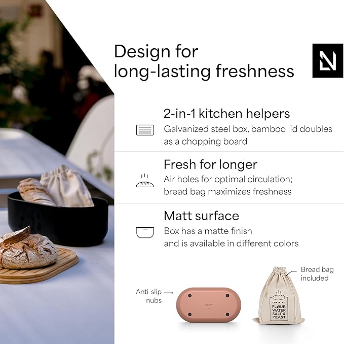 - LONG-LASTING FRESHNESS: The bread box has special ventilation holes on three sides, which provide optimal air circulation. The included linen bread bag keeps pastries & bread extra fresh for longer.