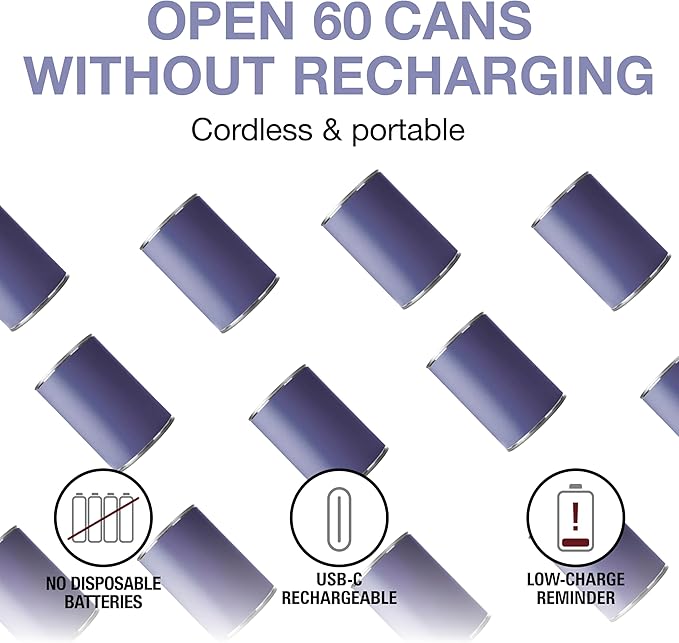 - OPENS 60 CANS ON A SINGLE CHARGE: This portable, rechargeable can opener is great for cookouts, picnics, camping and more. It has a battery indicator light that shows when it needs to be charged, and it fully charges in just 2 hours.