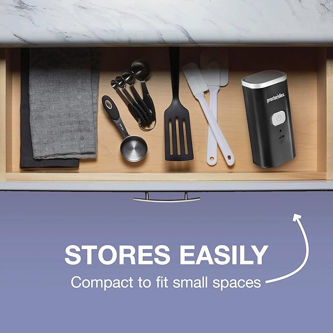 - SIMPLE TO STORE: This compact-sized electric can opener doesn't take up a lot of space. It easily fits in a kitchen drawer when it's not being used.