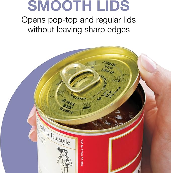 - SMOOTH, TOUCHABLE LID EDGES โ This automatic can opener cuts cans along the side, eliminating sharp edges on both pop-top or regular cans. The blade stays clean because it doesn't touch food, and the lid can be reused to store leftover canned food in the fridge.