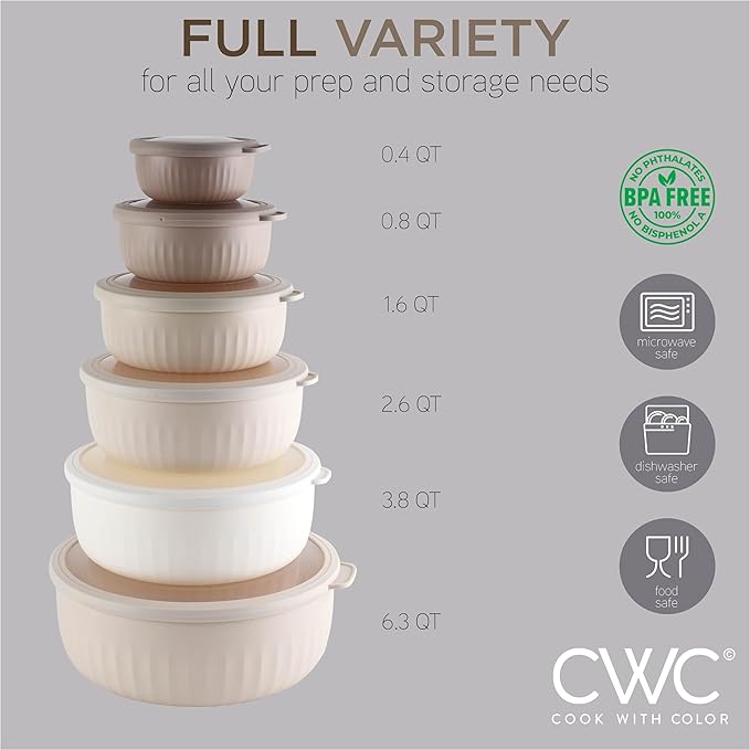 - Cook with Color 12 piece plastic mixing bowl set - non slip bowls with lids; easy to clean, sturdy mixing bowls.