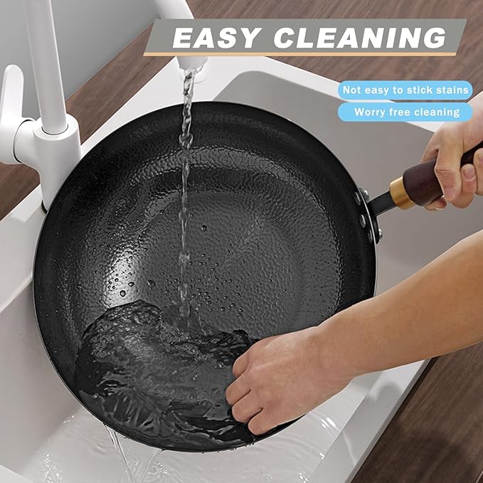 Carbon Steel Pan, 12.5″ Woks & Stir-Fry Pans with Wooden Lid Cookwares, Nonstick Wok, No Chemical Coated Flat Bottom Hand Hammered Chinese Wok For Gas