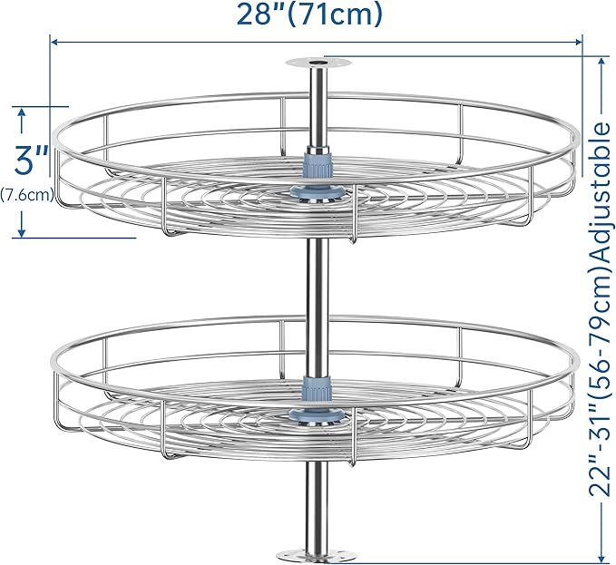 - Lazy Susan Specs: Dimensions (W x D x H):28"W x 28"D x 22.0"H, the telescoping post adjusts from 22" to 31". Net cabinet dimensions need to be 2 inches larger than product dimensions for a proper fit. Please carefully measure your cabinet. Exclude obstructions like hinges from your measurements.