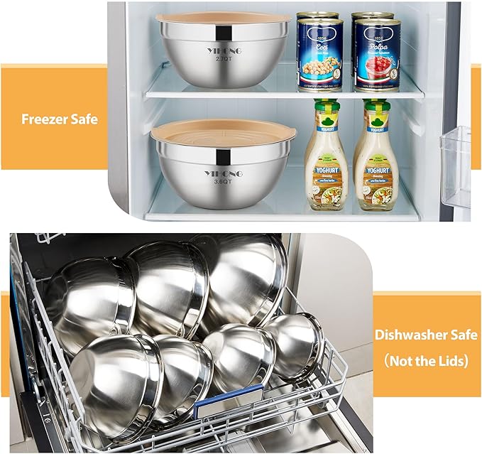 - Durable and High Quality β Made of high-quality stainless steel for lasting use, which is resistant and rustproof. These mixing bowls are dishwasher safe, more convenient for you and your family.